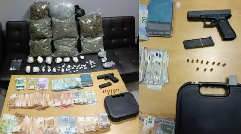 Κατασχέθηκαν πάνω 1.300 γραμμάρια κοκαΐνης και περισσότερα από 9 κιλά κάνναβης, ένα πιστόλι, μία γεμιστήρας και 11 φυσίγγια των 9 χιλιοστών.